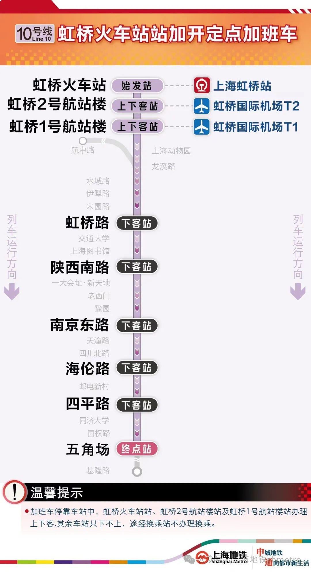 今日,10號(hào)線虹橋火車站加班車延長(zhǎng)至2月18日2:30。其中,10號(hào)線虹橋火車站站往五角場(chǎng)站方向定點(diǎn)加班車沿途僅停靠虹橋火車站站、虹橋2號(hào)航站樓站、虹橋1號(hào)航站樓站、虹橋路站、陜西南路站、南京東路站、海倫路站、四平路站、五角場(chǎng)站,其余車站跳停。??寇囌局?,虹橋火車站站、虹橋2號(hào)航站樓站、虹橋1號(hào)航站樓站可同時(shí)上下客,其余車站只下不上,途經(jīng)換乘站不可換乘。