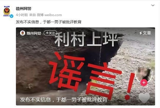 中新網(wǎng)4月26日電 據(jù)贛州市公安局網(wǎng)絡安全保衛(wèi)支隊官方微博消息,受近期持續(xù)強降雨影響,贛州市多地遭受洪澇災害。4月22日,于都縣公安局網(wǎng)安大隊在工作中發(fā)現(xiàn),網(wǎng)民鐘某在短視頻平臺發(fā)布了一張道路被雨水沖斷的圖片,并配以“于都縣利村鄉(xiāng)上坪村熱點新聞事件,雨天出行注意安全”等引人遐想的文字,引起網(wǎng)民熱議。