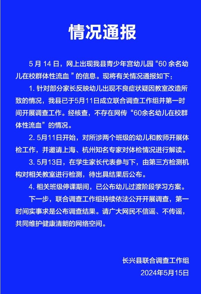 央視網(wǎng)消息:5月14日,網(wǎng)上出現(xiàn)浙江省湖州市長(zhǎng)興縣青少年宮幼兒園“60余名幼兒在校群體性流血”的信息。5月15日,長(zhǎng)興縣聯(lián)合調(diào)查工作組發(fā)布情況通報(bào)如下: