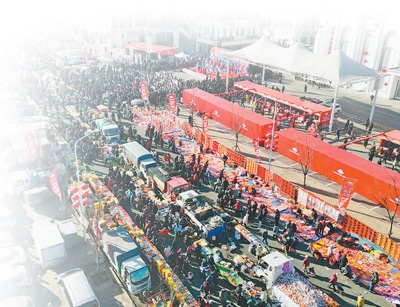 火紅的春聯(lián)鋪滿地面,大紅蠟燭上印著吉祥祝福,水產(chǎn)海鮮活蹦亂跳,流亭大饅頭白白胖胖……山東省青島市城陽區(qū)城陽大集,年貨琳瑯滿目,濃濃的年味撲面而來。