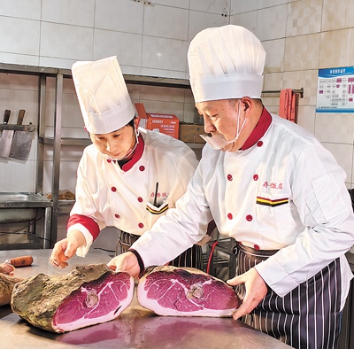 宣威市存香飯店,大廚徐天勇正忙著挑選食材,而烏金豬是制作宣威火腿的最佳原料?!半缰七^程也很重要,鹽的比例要恰到好處,多一分則咸,少一分則不夠味,經(jīng)過兩三年發(fā)酵,火腿就可以達(dá)到生吃的標(biāo)準(zhǔn)了?!毙焯煊掠霉轻樰p輕插入火腿的上、中、下部,火腿肉質(zhì)清香撲鼻,“就是它了?!?/p>