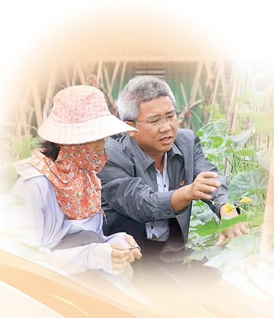 海南三亞市育才生態(tài)區(qū)那受村,駐村第一書記肖春雷(右)指導農(nóng)戶種植黃瓜。