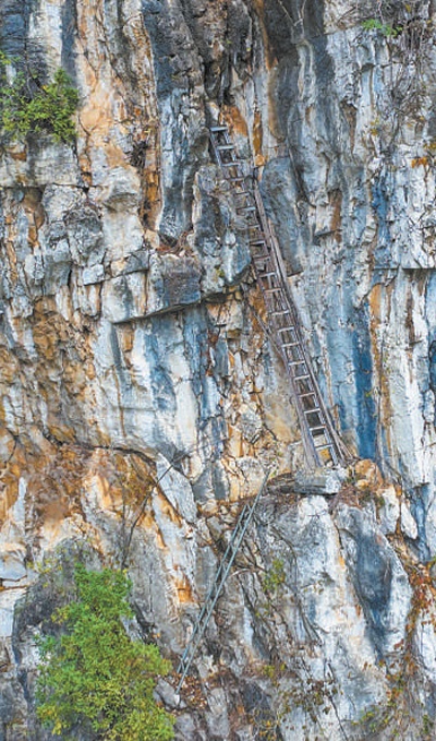 第三條路被村民們稱作“天路”。這是一段垂直高度200米的懸崖峭壁,大約1小時就能抵達(dá)山頂,但全程需要沿峭壁攀爬?!芭赖臅r候根本不敢往下看,只有初中的大孩子偶爾會在家長帶領(lǐng)下走這條路?!卞X慶輝說。