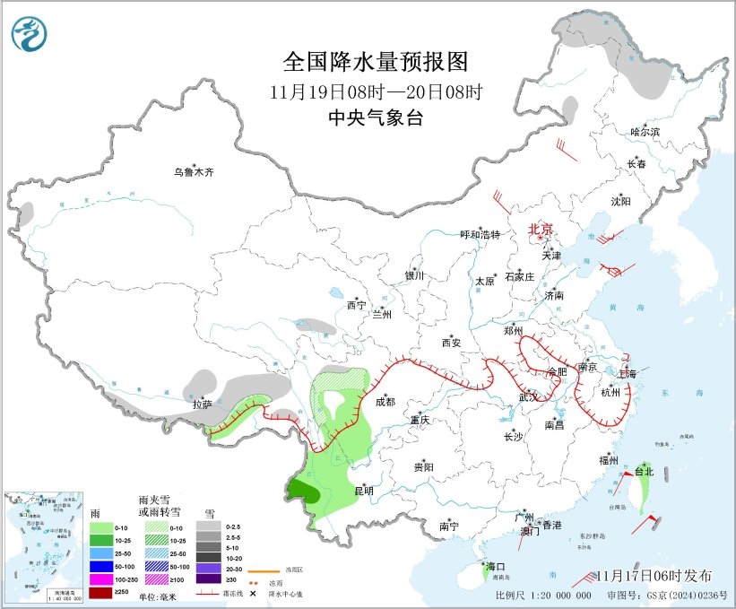 全國降水量預(yù)報(bào)圖(11月19日08時-20日08時)