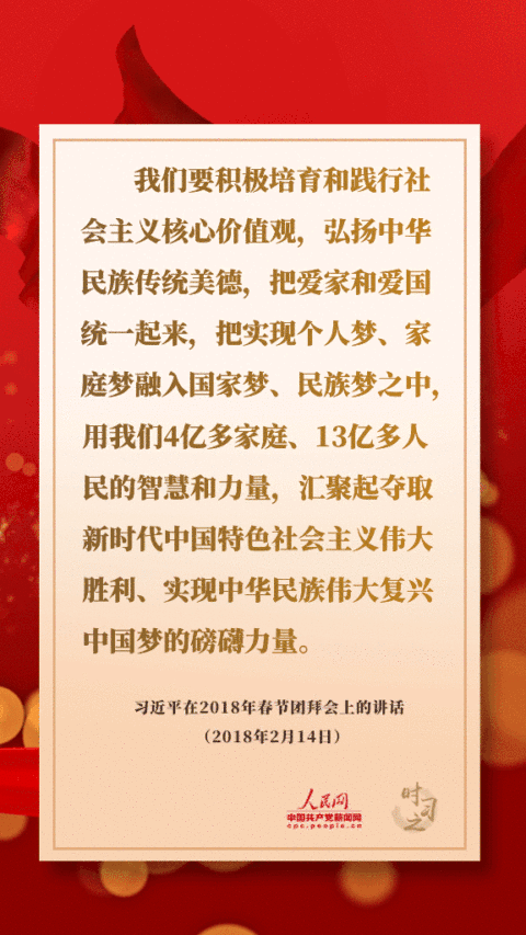 我們要積極培育和踐行社會主義核心價值觀,弘揚中華民族傳統(tǒng)美德,把愛家和愛國統(tǒng)一起來,把實現(xiàn)個人夢、家庭夢融入國家夢、民族夢之中,用我們4億多家庭、13億多人民的智慧和力量,匯聚起奪取新時代中國特色社會主義偉大勝利、實現(xiàn)中華民族偉大復興中國夢的磅礴力量。