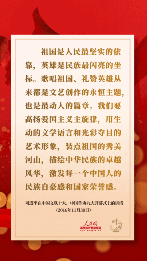 祖國是人民最堅實的依靠,英雄是民族最閃亮的坐標。歌唱祖國、禮贊英雄從來都是文藝創(chuàng)作的永恒主題,也是最動人的篇章。我們要高揚愛國主義主旋律,用生動的文學語言和光彩奪目的藝術(shù)形象,裝點祖國的秀美河山,描繪中華民族的卓越風華,激發(fā)每一個中國人的民族自豪感和國家榮譽感。