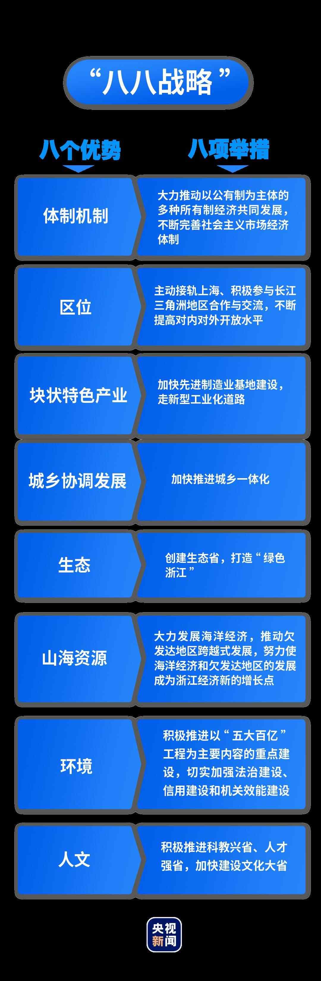 2003年7月10日,浙江省委十一屆四次全體(擴(kuò)大)會(huì)議召開。時(shí)任浙江省委書記習(xí)近平全面系統(tǒng)闡釋了浙江發(fā)展的“八個(gè)優(yōu)勢(shì)”,提出了指向未來的“八項(xiàng)舉措”,這就是“八八戰(zhàn)略”。
