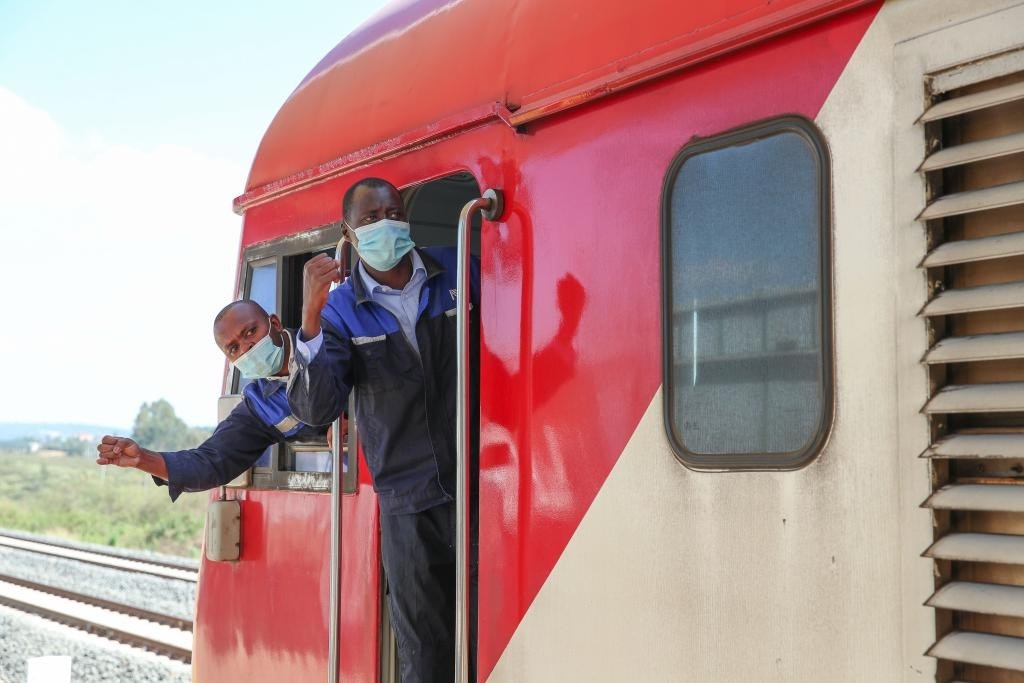 2022年3月25日,在肯尼亞內(nèi)羅畢,蒙內(nèi)鐵路肯方機(jī)車獨(dú)立班組成員與站臺工作人員確認(rèn)安全。