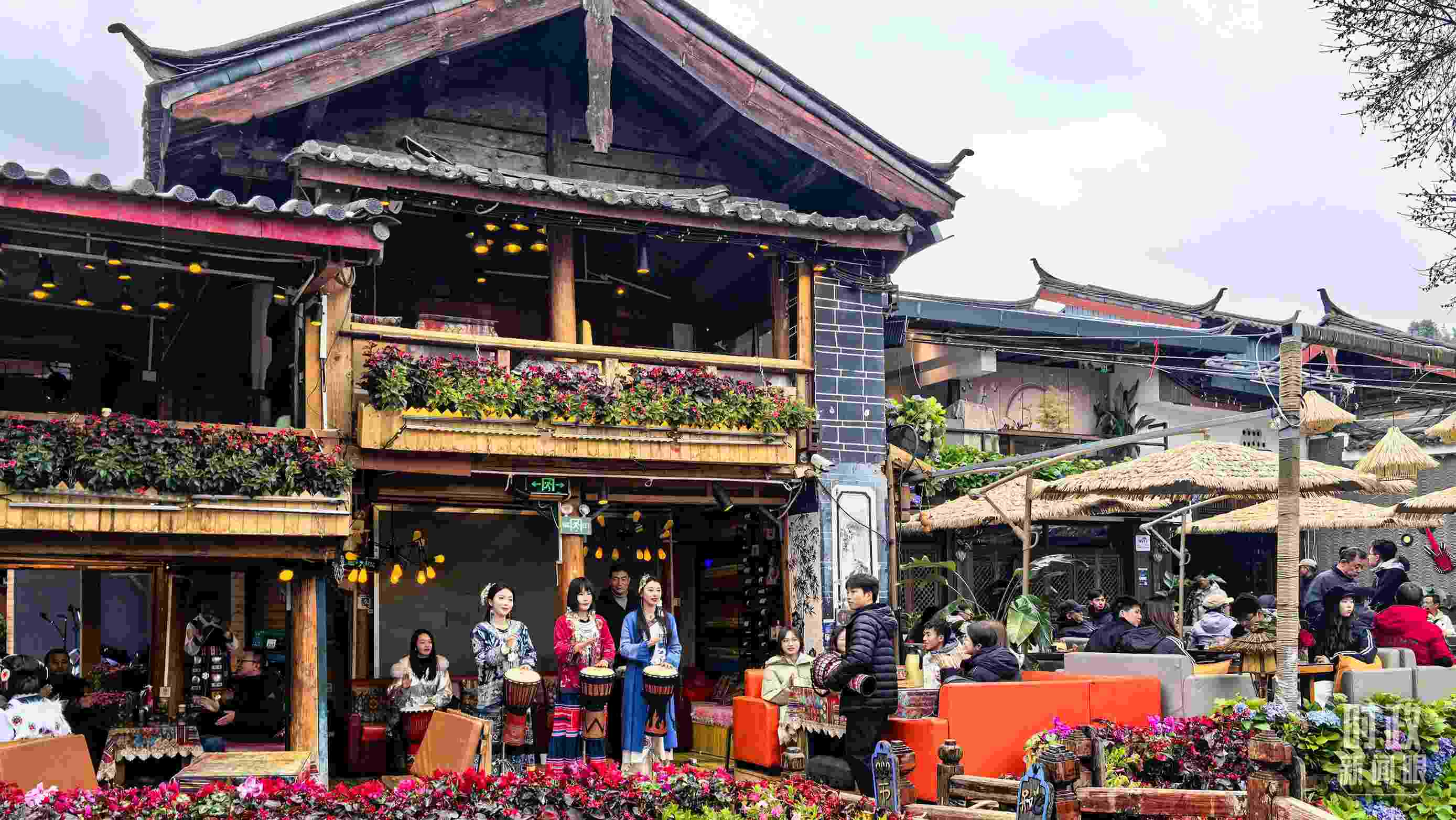 △古城商鋪門口的手鼓演奏。(總臺央視記者鄂介甫拍攝)