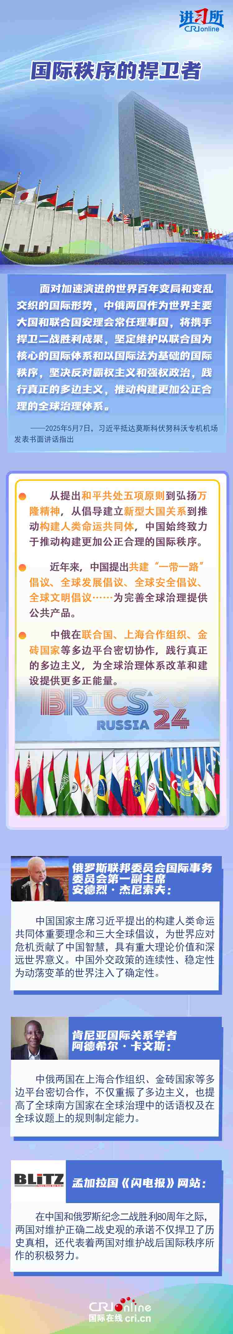 “兩國人民用鮮血和生命凝結(jié)的深厚情誼,如黃河之水奔騰不息,似伏爾加河寬廣深沉,成為中俄世代友好的不竭源泉。”今年是中國人民抗日戰(zhàn)爭、蘇聯(lián)偉大衛(wèi)國戰(zhàn)爭暨世界反法西斯戰(zhàn)爭勝利80周年,也是聯(lián)合國成立80周年。在這一重要歷史時間節(jié)點,習近平主席此訪不僅為中俄關(guān)系發(fā)展注入強勁動力,也向世界宣示中俄兩國攜手捍衛(wèi)二戰(zhàn)勝利成果的堅定意志。