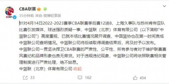 CBA聯(lián)賽官方微博15日凌晨發(fā)布消息表示:針對4月14日2022-2023賽季CBA聯(lián)賽季后賽12進8、上海久事隊與蘇州肯帝亞隊比賽引發(fā)媒體、球迷強烈質(zhì)疑一事,中籃聯(lián)(北京)體育有限公司(以下簡稱“中籃聯(lián)公司”)高度重視,已就本場比賽情況展開調(diào)查,中國籃協(xié)也在第一時間責成中籃聯(lián)公司查明情況。中籃聯(lián)公司待后續(xù)取得調(diào)查結(jié)果后,將及時予以發(fā)布。