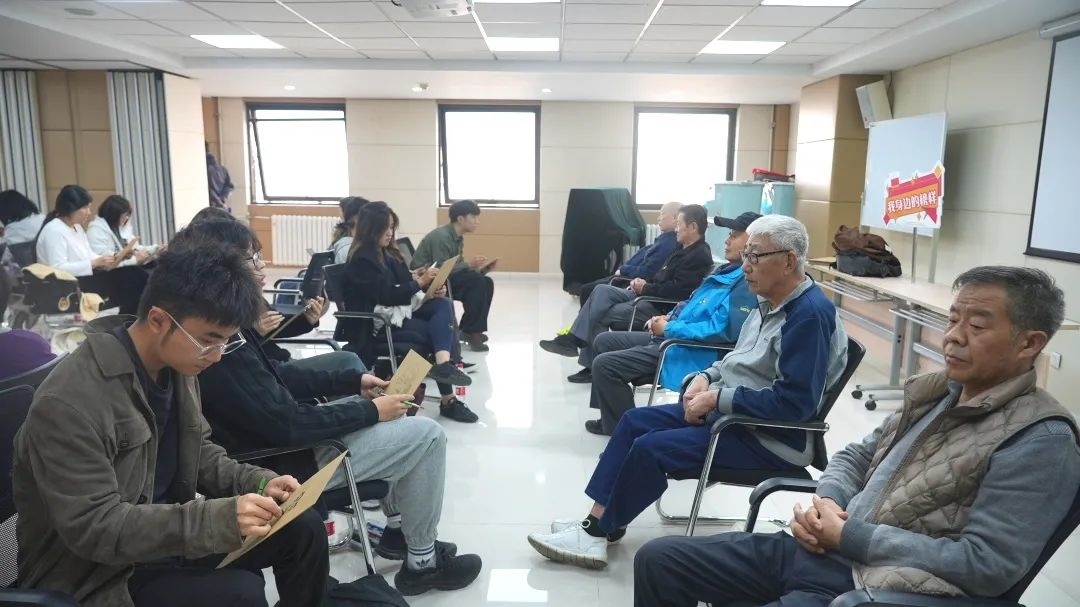 在街道黨群服務(wù)中心小課堂上,中央美院的同學(xué)認(rèn)真聆聽社區(qū)老黨員姜德堂同志講述紅色革命故事,傳承革命精神。同學(xué)們還開展了“送學(xué)上門”服務(wù),為地區(qū)老年人、企業(yè)單位送上“精神大餐”。
