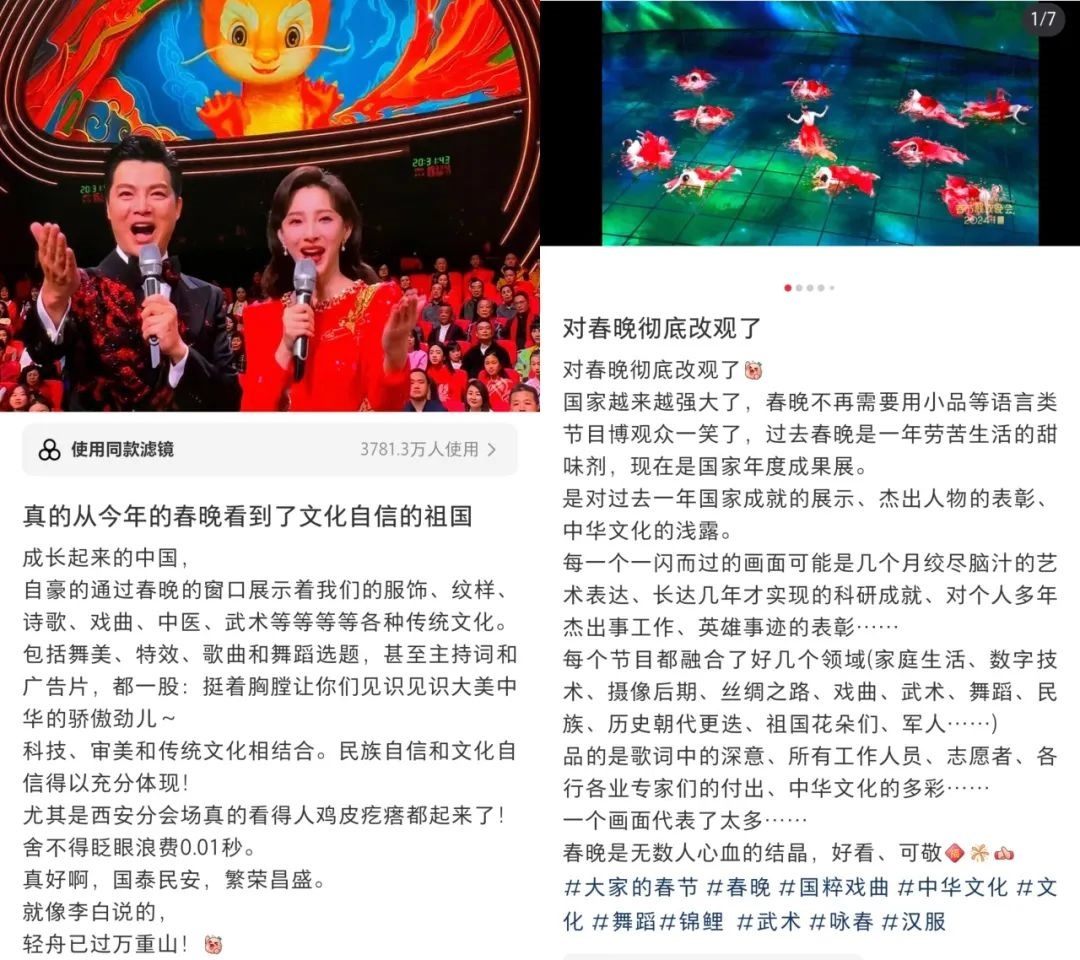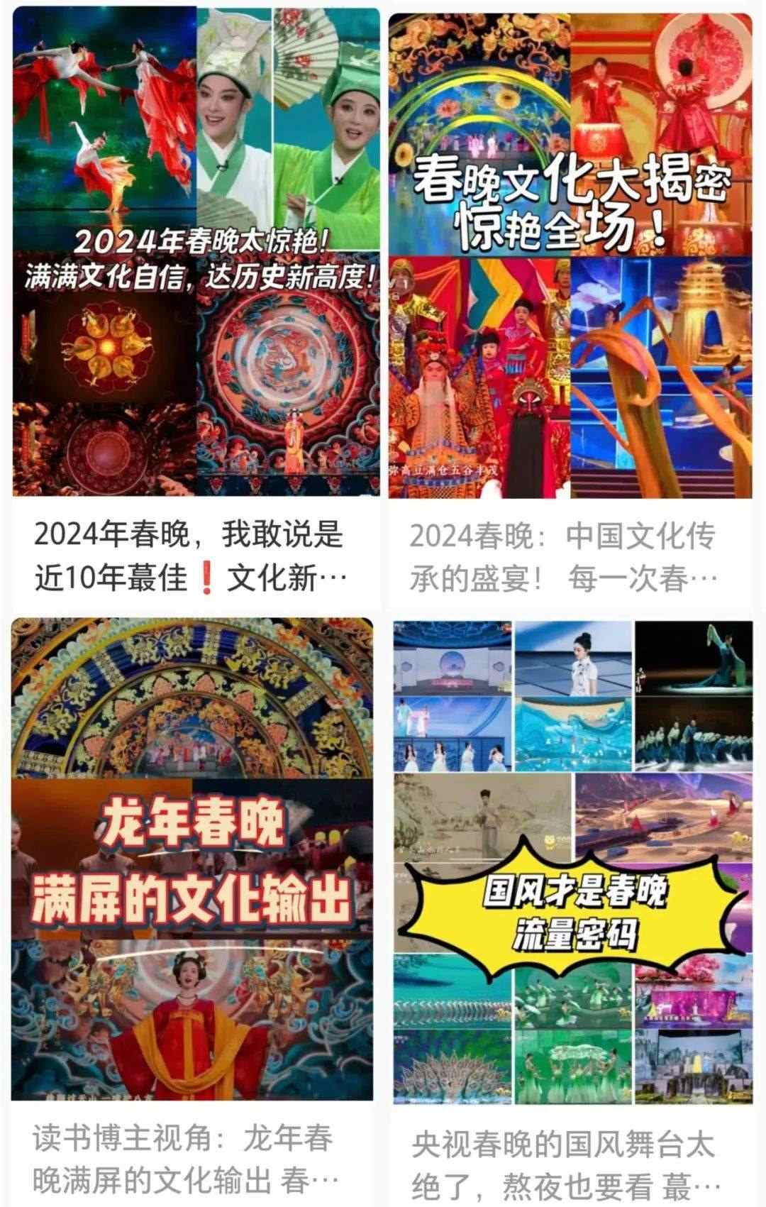 春晚的文化展現(xiàn),在國(guó)人中也引起了熱烈反響?!懊恳粋€(gè)文化類(lèi)節(jié)目都蘊(yùn)含著獨(dú)特的中國(guó)之美,這種美有的跨越千年,有的多經(jīng)磨難,春晚給我們呈現(xiàn)了一場(chǎng)場(chǎng)宏大的視聽(tīng)盛宴,作為觀眾很難不動(dòng)容”“從今年春晚真真切切地感受到了文化自信,大好河山,傳統(tǒng)文化,國(guó)家強(qiáng)盛,美美與共”“文化傳統(tǒng)特色給各個(gè)節(jié)目都刷了創(chuàng)意的漆,霸氣從節(jié)目中升騰,自信從感嘆中生發(fā),真妙”......