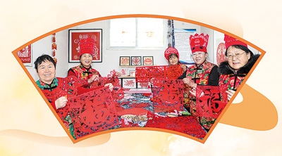韓淑鳳(左二)帶領村民展示剪紙作品。