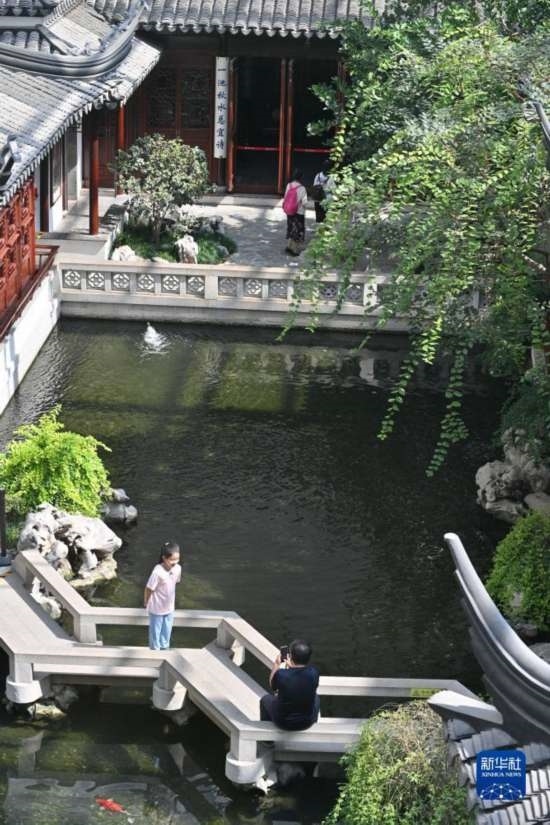 8月28日,參觀者在中國(guó)園林博物館參觀室內(nèi)景觀區(qū)“暢園”。