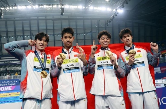 2月11日,中國(guó)隊(duì)選手王浩宇、張展碩、季新杰和潘展樂(從左到右)在頒獎(jiǎng)儀式后合影慶祝。新華社記者 雒圓 攝
