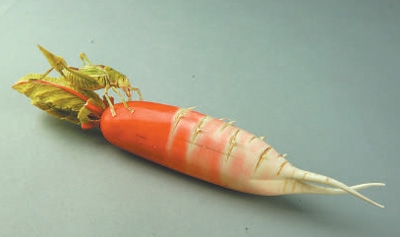 這根“蘿卜”長約27厘米,重229克。根莖由上部的紅色漸變?yōu)橹胁康姆奂t和根部的白色,根須自然彎曲,葉片呈綠色。蘿卜上一只蟈蟈伸出前肢正由葉片爬向莖部,也顯得動(dòng)感十足。