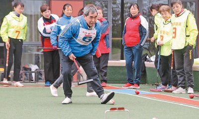 浙江省湖州市德清縣市民活動(dòng)中心,老年門(mén)球愛(ài)好者在揮桿競(jìng)技。