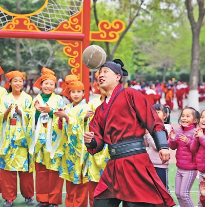 春風(fēng)和煦,山東省淄博市臨淄區(qū),一場(chǎng)別開(kāi)生面的蹴鞠表演賽正在上演。來(lái)自臨淄蹴鞠隊(duì)的李偉鵬用腳面觸球,順勢(shì)將球挑起,隨后高高躍起,以一記精準(zhǔn)的頭球讓球從“風(fēng)流眼”(即球門)正中穿過(guò)?!斑恕筌姷靡换I!”裁判敲響鑼鼓,宣布李偉鵬所在的隊(duì)伍得分。