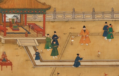 捶者,打也;丸者,球也?!安簧賹W(xué)生剛接觸捶丸時(shí),說(shuō)它像現(xiàn)代的高爾夫。其實(shí),捶丸比高爾夫運(yùn)動(dòng)歷史更悠久?!逼巾斏綄W(xué)院陶瓷學(xué)院院長(zhǎng)梅國(guó)建介紹,捶丸源自唐代擊鞠(馬球)和步打球,傳至宋朝逐漸演變?yōu)橐来螕羟虻姆菍?duì)抗性比賽,名稱也變?yōu)榇吠?,現(xiàn)藏于故宮博物院的《明宣宗行樂(lè)圖》中就描繪了宮中捶丸的場(chǎng)景。