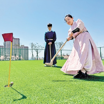 瞄球、揮擊,隨著一聲清脆的擊打聲,陶瓷小球劃出優(yōu)美的弧線,停到插有旗桿的“球窩”附近。春日遲遲,在河南省平頂山學(xué)院捶丸球場(chǎng),一群學(xué)生身著漢服或運(yùn)動(dòng)服飾,借助形狀各異、長(zhǎng)短不一的球杖,對(duì)草坪上的陶瓷球進(jìn)行輪番擊打。