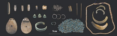 西藏康馬瑪不錯遺址第二期出土的遺物(石質、骨質、金屬裝飾品,骨針、滑石珠、紅玉髓等)。